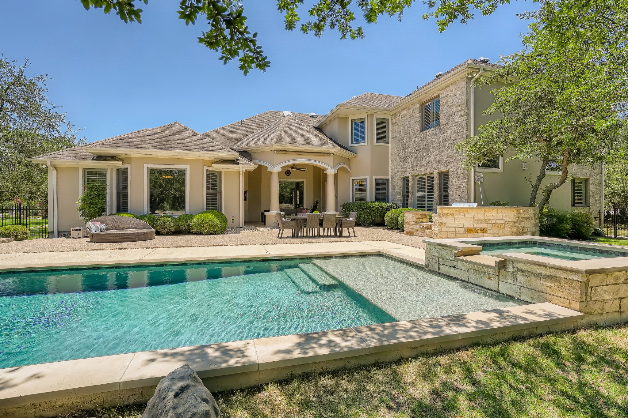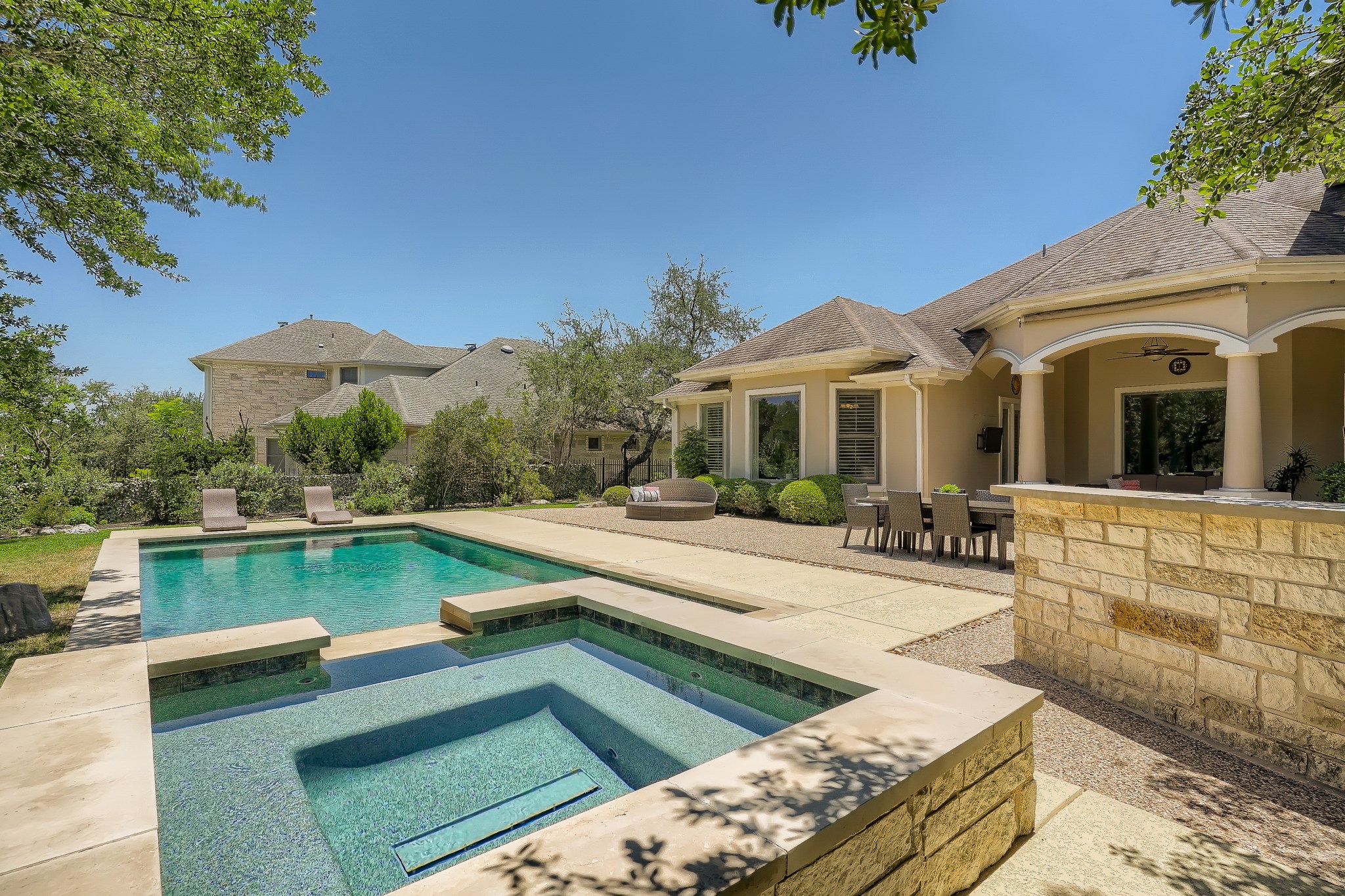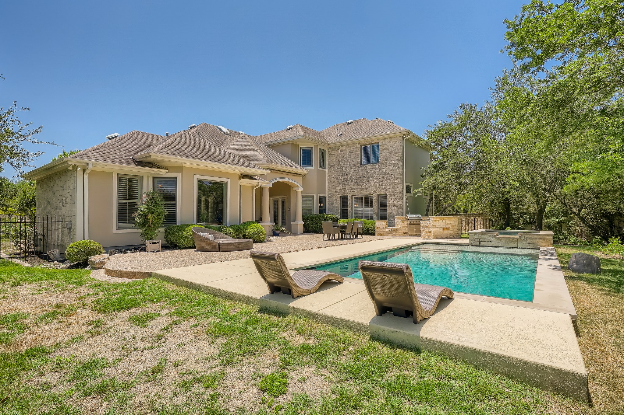 | Amazing 5,182 square foot, 5+ bedroom Bellview Custom Home that combines luxury, quality, practicality & comfort. A Sophisticated masterpiece on lushly landscaped tree-covered, 1.26 acre, flat cul-de-sac lot in the prestigious Preserve Enclave section of River Place. No pending new home construction or street expansion on Merrywing. This custom one-of-a-kind estate features a veranda, pool, spa & outdoor kitchen designed for Texas summers. 3,700 sq ft of living space downstairs includes an oversized primary bedroom, main level guest bedroom, a dedicated office with private bath which can be a 6th bedroom, formal dining and two living areas. The upstairs is completed with walk-in climate controlled 20′ x 17′ storage room, 3 additional bedrooms and a spacious upstairs bonus room. Upstairs also includes a second dedicated office/flex space options for use include: craft room, exercise room, small media room that has space to be enlarged. Interior features include Cherry hardwoods, 12’ high ceilings on main level, gourmet kitchen with a walk-in pantry, granite counters, bar area & built-ins in family room. Separate gated boat storage, dog run, and an oversized 3 car garage with lots of built-in cabinetry. One mile to River Place Elementary School and zoned for highly acclaimed Vandegrift High School |
