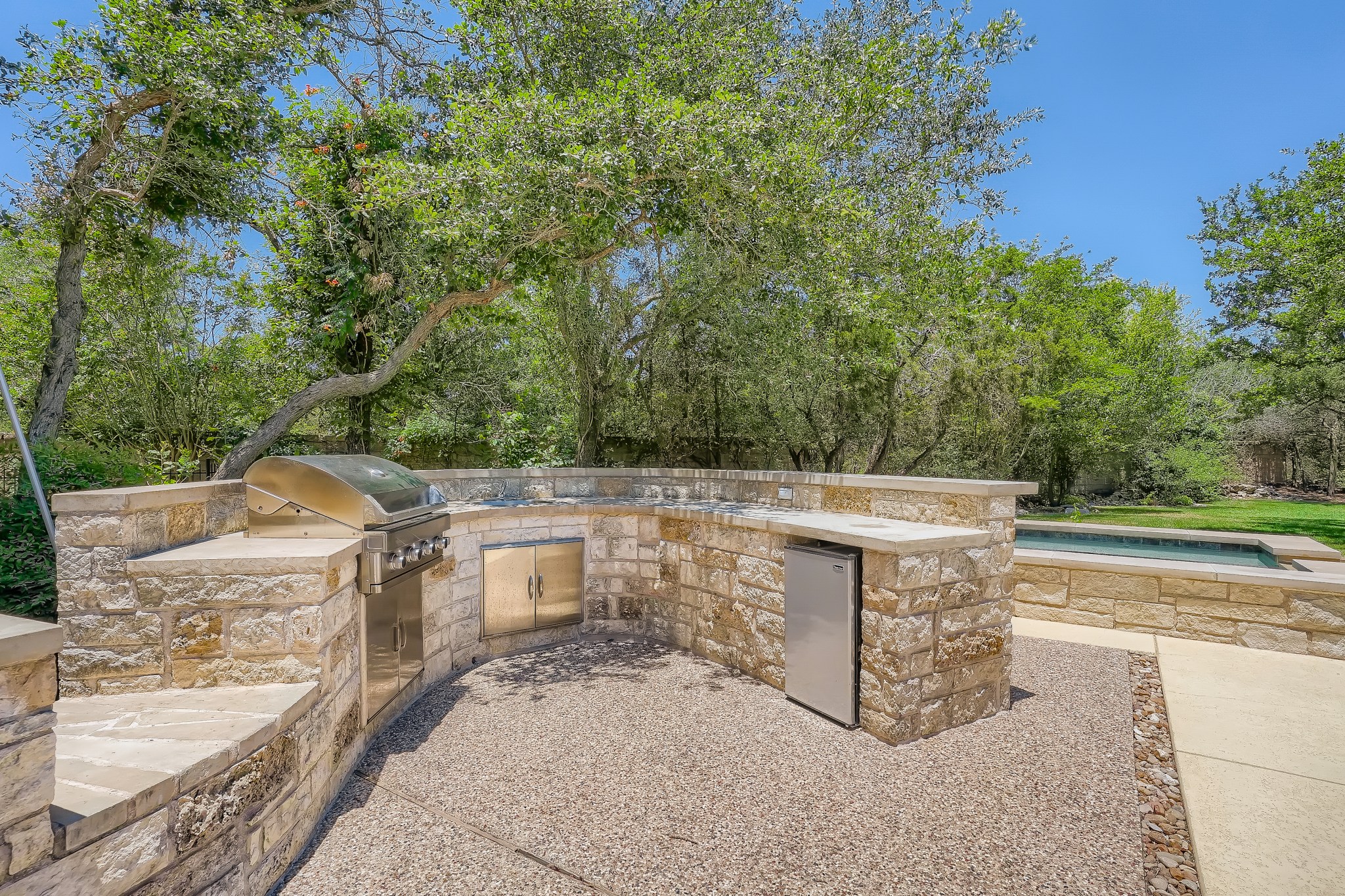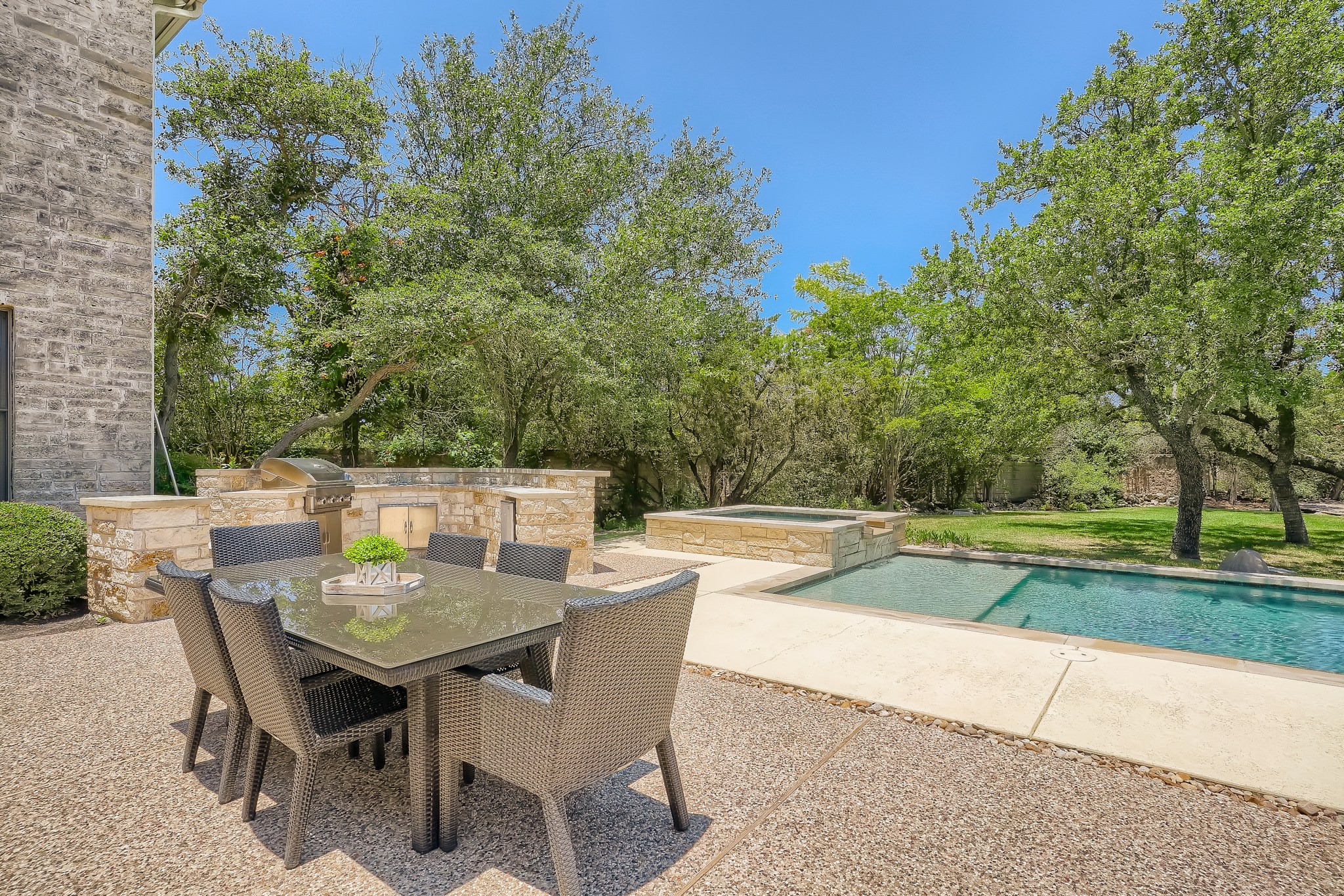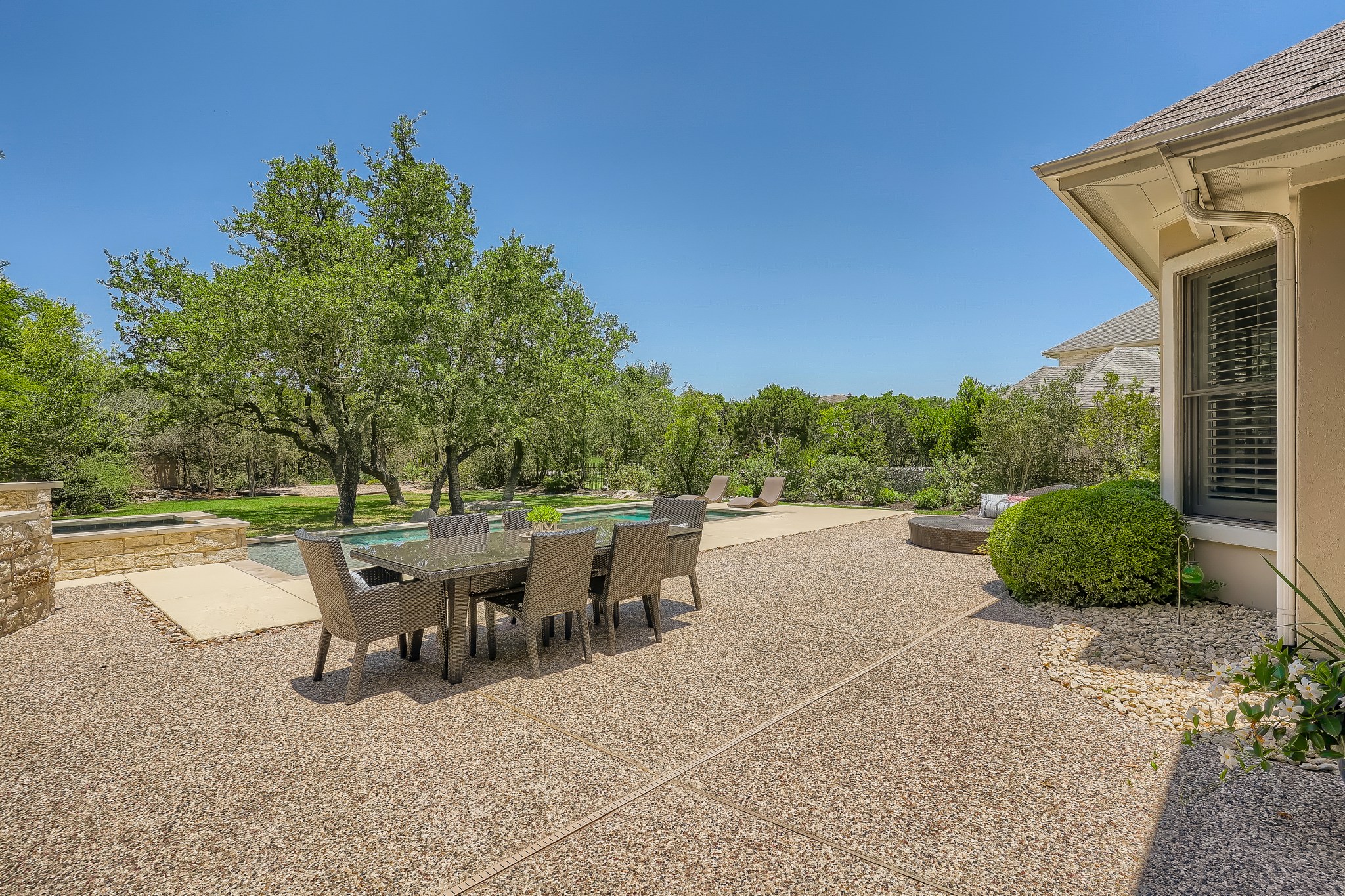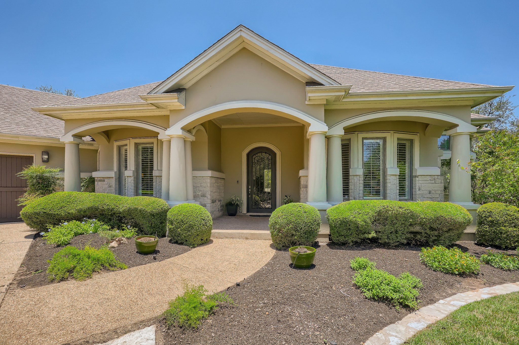 | Amazing 5,182 square foot, 5+ bedroom Bellview Custom Home that combines luxury, quality, practicality & comfort. A Sophisticated masterpiece on lushly landscaped tree-covered, 1.26 acre, flat cul-de-sac lot in the prestigious Preserve Enclave section of River Place. No pending new home construction or street expansion on Merrywing. This custom one-of-a-kind estate features a veranda, pool, spa & outdoor kitchen designed for Texas summers. 3,700 sq ft of living space downstairs includes an oversized primary bedroom, main level guest bedroom, a dedicated office with private bath which can be a 6th bedroom, formal dining and two living areas. The upstairs is completed with walk-in climate controlled 20′ x 17′ storage room, 3 additional bedrooms and a spacious upstairs bonus room. Upstairs also includes a second dedicated office/flex space options for use include: craft room, exercise room, small media room that has space to be enlarged. Interior features include Cherry hardwoods, 12’ high ceilings on main level, gourmet kitchen with a walk-in pantry, granite counters, bar area & built-ins in family room. Separate gated boat storage, dog run, and an oversized 3 car garage with lots of built-in cabinetry. One mile to River Place Elementary School and zoned for highly acclaimed Vandegrift High School |